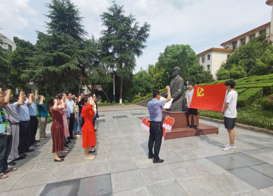 下午3:00,两个党支部共31名党员准时来到核学楼张爱萍将军铜像前,在党政办党支部书记陈柒叁的带领下,面向党旗、高举右手、庄严宣誓,共温入党誓词。