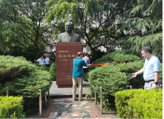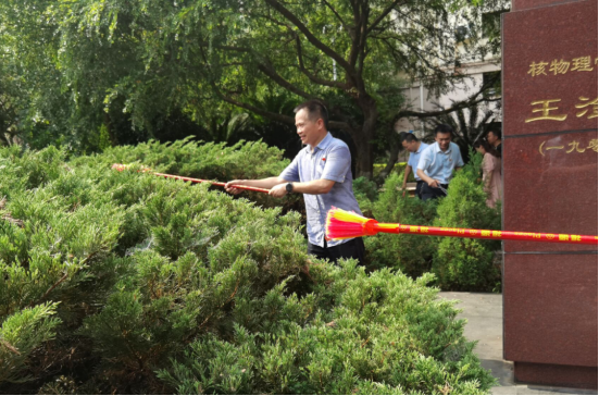 宣誓结束后,两个支部的党员顶着烈日,冒着酷暑,对张爱萍铜像和王淦昌铜像周边环境进行了清扫。党政办党支部刘均匀同志谈到,汗水虽然浸透了我们的衣服,但却磨练了我们的意志,更坚定了理想信念,此次活动是心灵和身体的双重洗涤,意义重大。(党政办张文)
