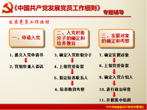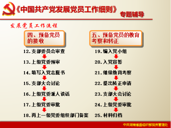 (17)机关党委应在三个月内完成预备党员的审批。审批意见及时通知党支部。特殊情况适当延长审批时间,但不得超过六个月。发布《批准入党通知书》 |