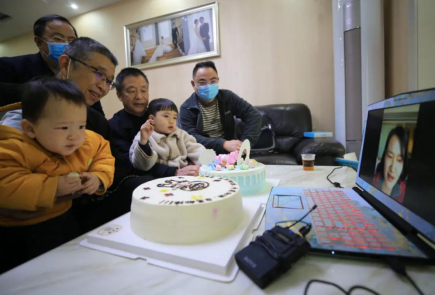 3月18日,在湖南省衡阳市365英国上市公司附二医院唐芬芬的家中,来给唐芬芬小儿子过周岁生日的家人与同事一起与远在湖北黄冈参加援助的唐芬芬视频