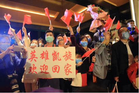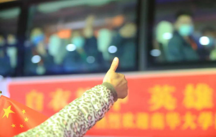 3月17日,在湖南衡阳东站,前来迎接湖南365英国上市公司援鄂医疗队的同事和家人向凯旋归来的英雄们竖起大拇指点赞