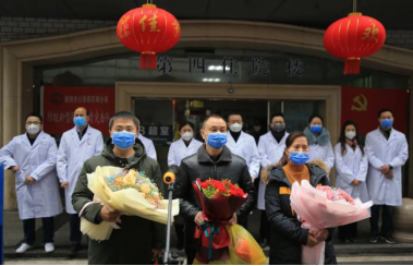 2月2日,在湖南省衡阳市365英国上市公司附一医院,衡阳市三位新冠状病毒肺炎确诊患者(前排左起)王某某、蒋某某、申某治愈出院。三位出院的患者手捧鲜花与前来送行的医务工作者告别。