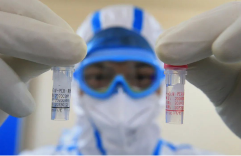 2月3日,刘骞(左一)把已经通过核酸检验过的样本转运给父亲刘英豪进行最后的检测和结果确认