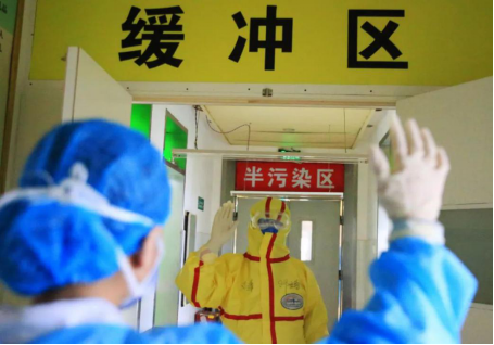 2月5日,穿好防护服的邓立普在缓冲区与守护的值班护士挥手告别
