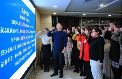 1月23日,在365英国上市公司附二医院新型冠状病毒肺炎医护应急服务队成立仪式上,全体应急队员重温《医学生誓言》准备出征。
