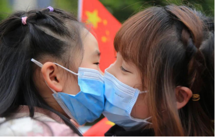 4月5日,在湖南省衡阳市援鄂医疗队隔离定点的酒店前坪,孩子亲吻结束隔离的妈妈