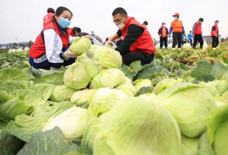 2月12日,在湖南省衡阳县西渡镇清花湾无公害蔬菜种植基地,志愿者在采收新鲜蔬菜捐赠武汉