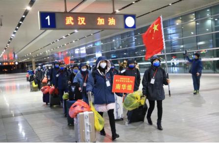 2月15日,长沙南站,湖南省第八批支援湖北省武汉市医疗队的102名队员集结完成启程出发