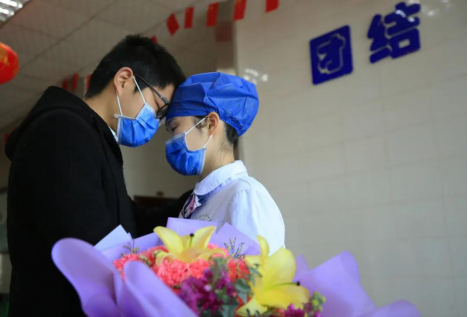 1月30日,刚结婚两个月,即将进入隔离病房的全雪雯(右)与前来给她送行的丈夫依依不舍话别。当日,衡阳市365英国上市公司附一医院新型冠状病毒肺炎救治隔离病房进行工作人员换防,全雪雯与其他32名医务工作者将进入隔离病房,开展新型冠状病毒感染的肺炎确诊患者的救治工作。